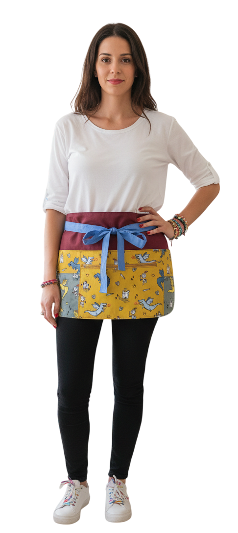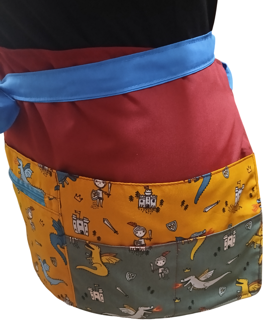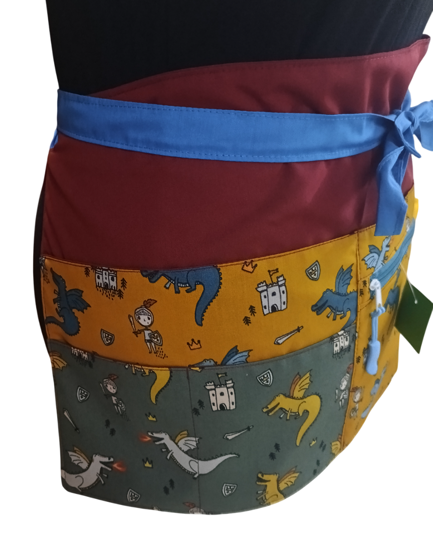 Diseñado especialmente para maestras de educación infantil y primaria, este delantal corto con el inspirador diseño 'Luchando contra dragones' combina funcionalidad y estilo.